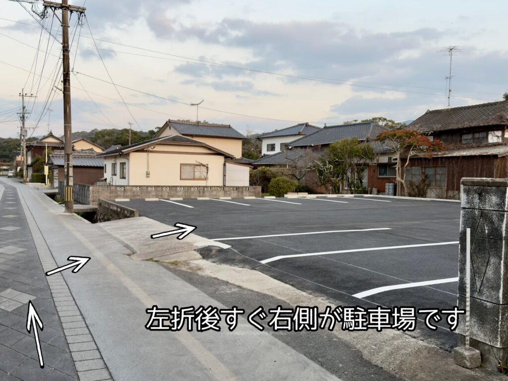 ②直進すると左側に「こおした旅館専用駐車場」の看板が見え、左折するとすぐ右手に当旅館専用駐車場